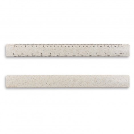 Trendy 30cm ruler manufactured from 30% wheat straw fibre and 70% ABS. It features mm/cm/inches black printing on one side and a scale ruler shape for sturdiness.