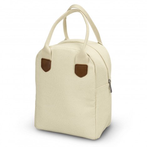 Stylish lunch bag made from robust 450gsm cotton canvas with PE foam insulation and a water-resistant PEVA lining. The cotton carry handles have leather-look PU accents, and the bag has a zippered main compartment with a slip pocket at the front.