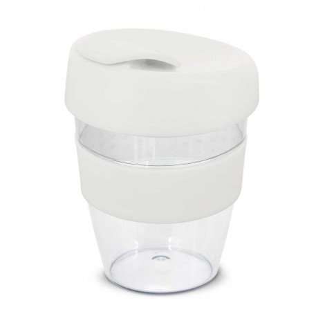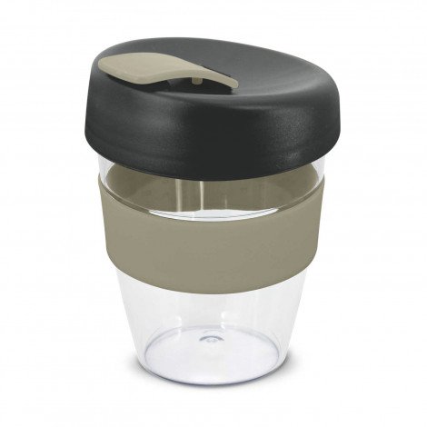 Crystal-clear 350ml reusable coffee cup with a heat-resistant silicone band and a secure screw on lid with a splashproof flip closure. The cup is manufactured from AS plastic and the lid is polypropylene. Both materials are BPA-free. The lid, flip closure and band can be mixed and matched in any colour combination from the standard colours at no extra cost. Up to five different colour combinations are included in the price and more are available for an additional charge. It can be presented in an optional natural gift box on request. This product is not dishwasher safe and handwashing is recommended. Express Cup Claritas is protected under New Zealand Design Registration No. 419451 and Australian Design Registration No. 361937.