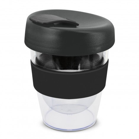 Reusable 230ml double wall coffee cup which will keep drinks hot for longer. It has a silicone band and a secure screw on lid with a splashproof flip closure. The cup is manufactured from crystal-clear AS plastic and the lid is polypropylene. Both materials are BPA-free. The lid, flip closure and band can be mixed and matched in any colour combination from the standard colours at no extra cost. Up to five different colour combinations are included in the price and more are available for an additional charge. An optional natural gift box is available on request. This product is not dishwasher safe and handwashing is recommended. Express Cup Leviosa is protected under New Zealand Design Registration No. 419451 and Australian Design Registration No. 361937.