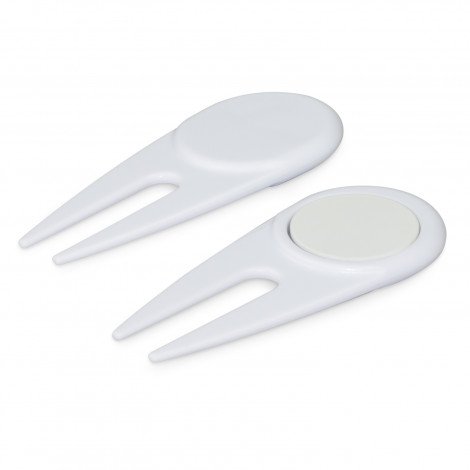 Plastic divot repairer with a metal golf ball marker which is securely held in place with a strong magnet.