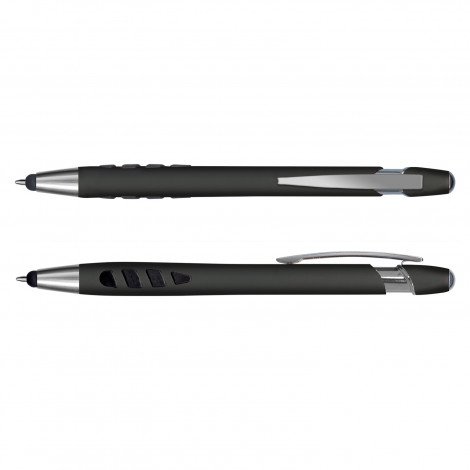 Retractable plastic ballpoint pen with a metallic barrel and soft rubber inserts in the grip. It has shiny chrome trim, a stylus, and a black refill with 1200 metres of German manufactured Dokumental ink. Havana Stylus can be presented in an optional pen sleeve.