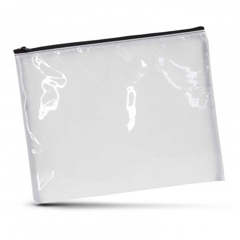 Large cosmetic bag which is manufactured from soft transparent plastic. It has a black zippered closure with black stitching and a polyester lining which can be branded in full colour on both sides at no extra cost. A production lead time of 20 working days applies to this product by air freight and larger orders can be sea freighted on request to reduce the freight cost.