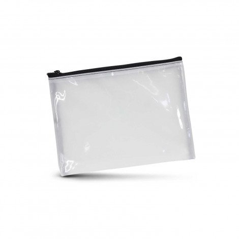 Small cosmetic bag which is manufactured from soft transparent plastic. It has a black zippered closure with black stitching and a polyester lining which can be branded in full colour on both sides at no extra cost. A production lead time of 20 working days applies to this product by air freight and larger orders can be sea freighted on request to reduce the freight cost.