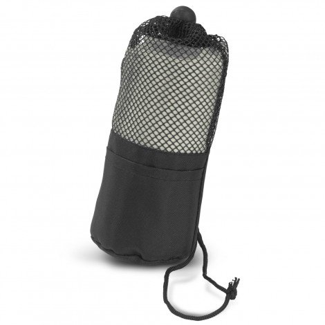 Space-saving 100cm x 30cm gym towel that is manufactured from absorbent 200gsm polyester blended with nylon to reduce drying time. It is ultra-compact, incredibly light and dries fast so is ideal for the gym, travelling, camping, sport and outdoor activities. Mako has an elastic loop with a domed closure for hanging out to dry and is presented in a drawstring bag with an external slip pocket. Branding is on the drawstring bag.