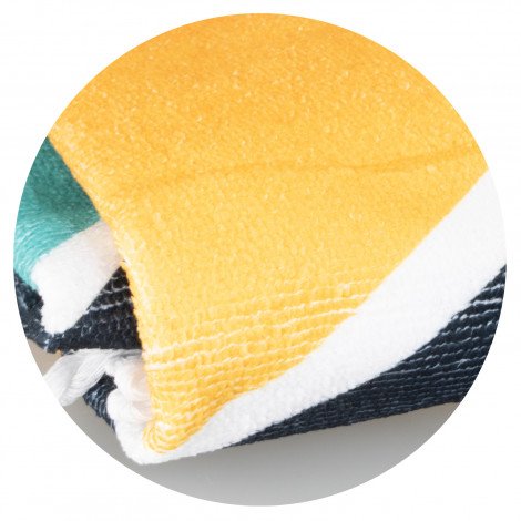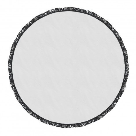 Trendy 150cm round beach towel which is manufactured from fast-drying 240gsm polyester with optional white or black tassels. It can be branded on one side with edge-to-edge full colour print and there is a choice of eight overlocking thread colours. A production lead time of 30 working days applies to this product by air freight and larger orders can be sea freighted on request to reduce the freight cost.