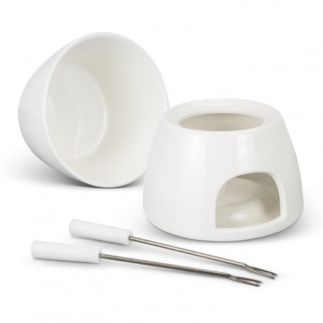 Mini ceramic fondue set that includes two stainless steel serving skewers with polypropylene handles. Simply melt cheese or chocolate in the fondue bowl using a tealight candle for heat, and dip various treats into the bowl using the skewers. This novel fondue set is sure to provide engaging entertainment for guests at dinners or parties. The set includes a tealight candle holder, a bowl and two skewers. Tealight candles are not included.