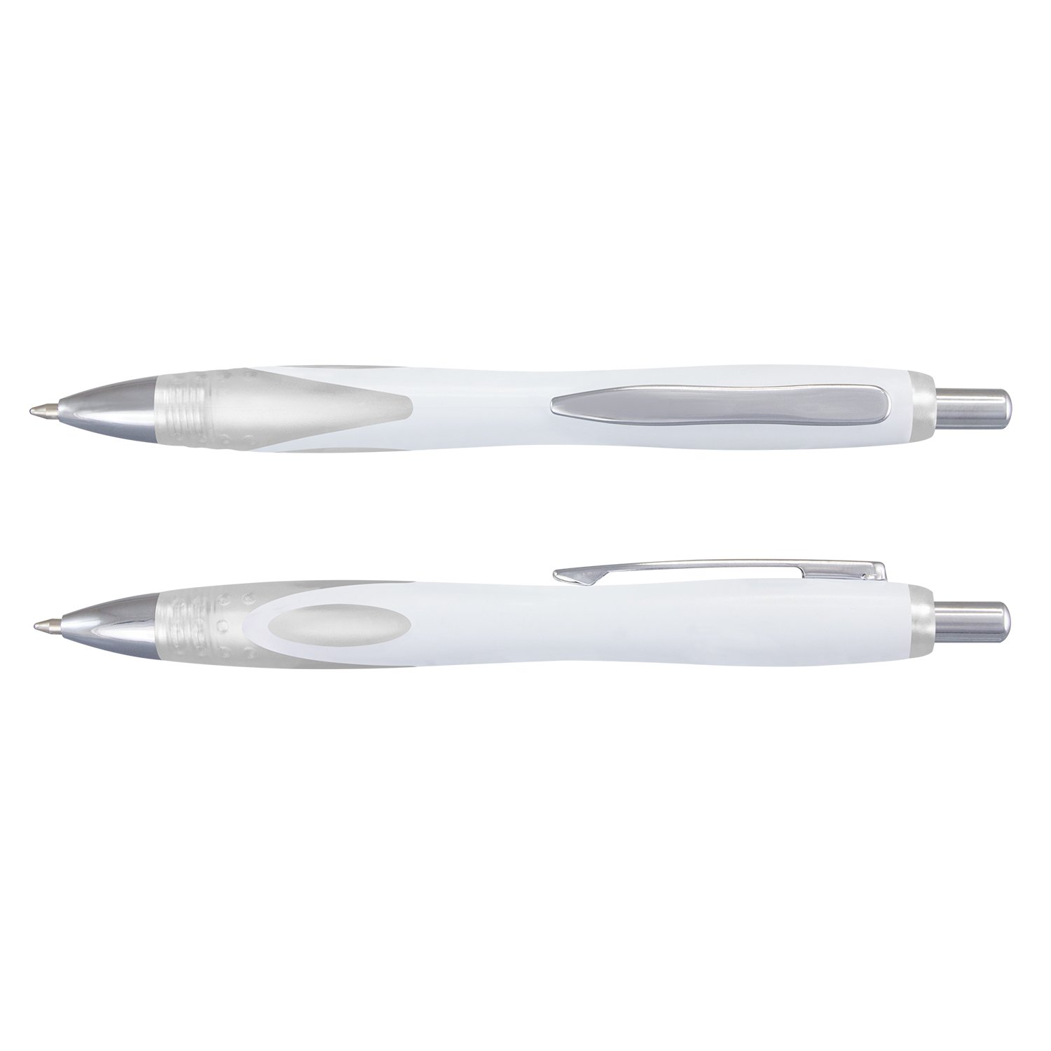 Retractable plastic ballpoint pen with a white barrel which features a double injected frosted translucent grip and shiny chrome trim. It has a blue large volume refill with 1800 metres of German manufactured Dokumental ink and can be presented in an optional pen sleeve.