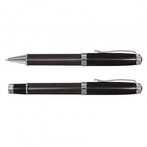 Premium gift set with a matching ball pen and rolling ball pen which can be beautifully presented in a matte black gift box. Both pens have genuine carbon fibre barrels and shiny chrome accents. The ball pen has a black large volume refill with 1800 metres of German manufactured Dokumental ink and a tungsten carbide ball for improved writing quality. The rolling ball pen has a refill with 1500 metres of black writing ink that will not dry out even if the cap isn't replaced after use. The upper barrel of the ball pen and the cap of the rolling ball pen are manufactured from brass and laser engrave to a mirror finish.