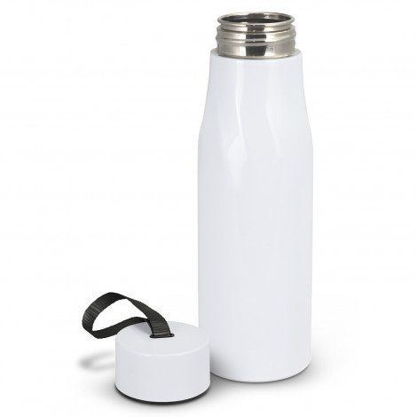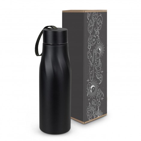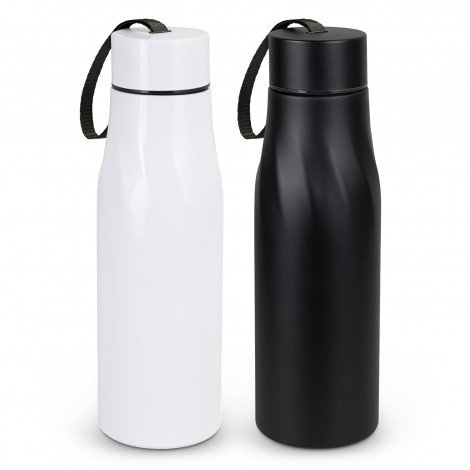 Fashion-inspired stainless steel 750ml bottle with a gloss finish. It has a screw-on lid with a black ribbon handle. Tornado is BPA-free. The bottle laser engraves to a shiny stainless steel finish. This product is not dishwasher safe, and handwashing is recommended.